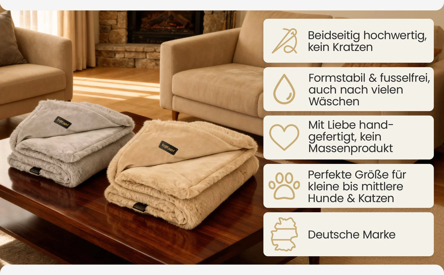 „Cashmere Grau“ und „Cashmere Beige“ unterscheiden sich nur optisch. Qualität, Material und Größe sind identisch – wähle die Farbe, die am besten zu deinem Interior oder Fell passt.