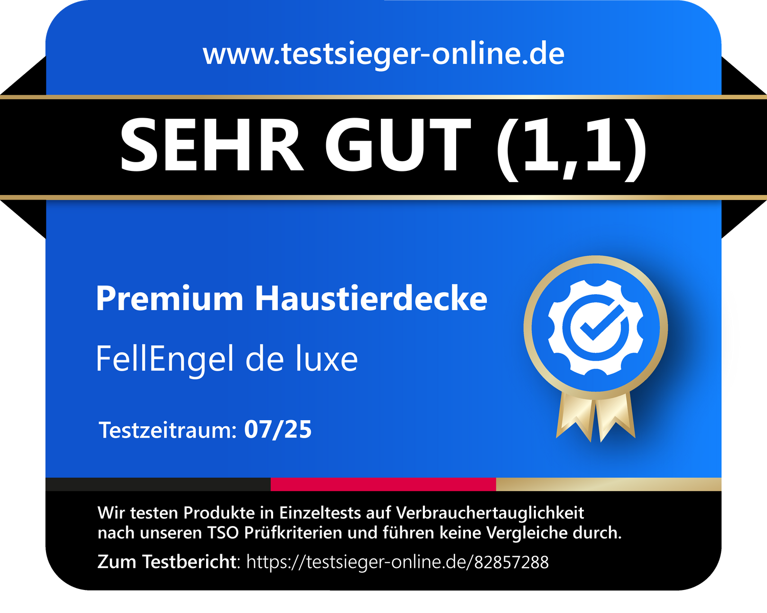 Im Einzeltest von testsieger-online.de (07/2025) erhielt die FellEngel de luxe Premium-Haustierdecke die Gesamtnote SEHR GUT (1,1). Das bestätigt die hohe Material- und Verarbeitungsqualität sowie die pflegeleichte Handhabung.