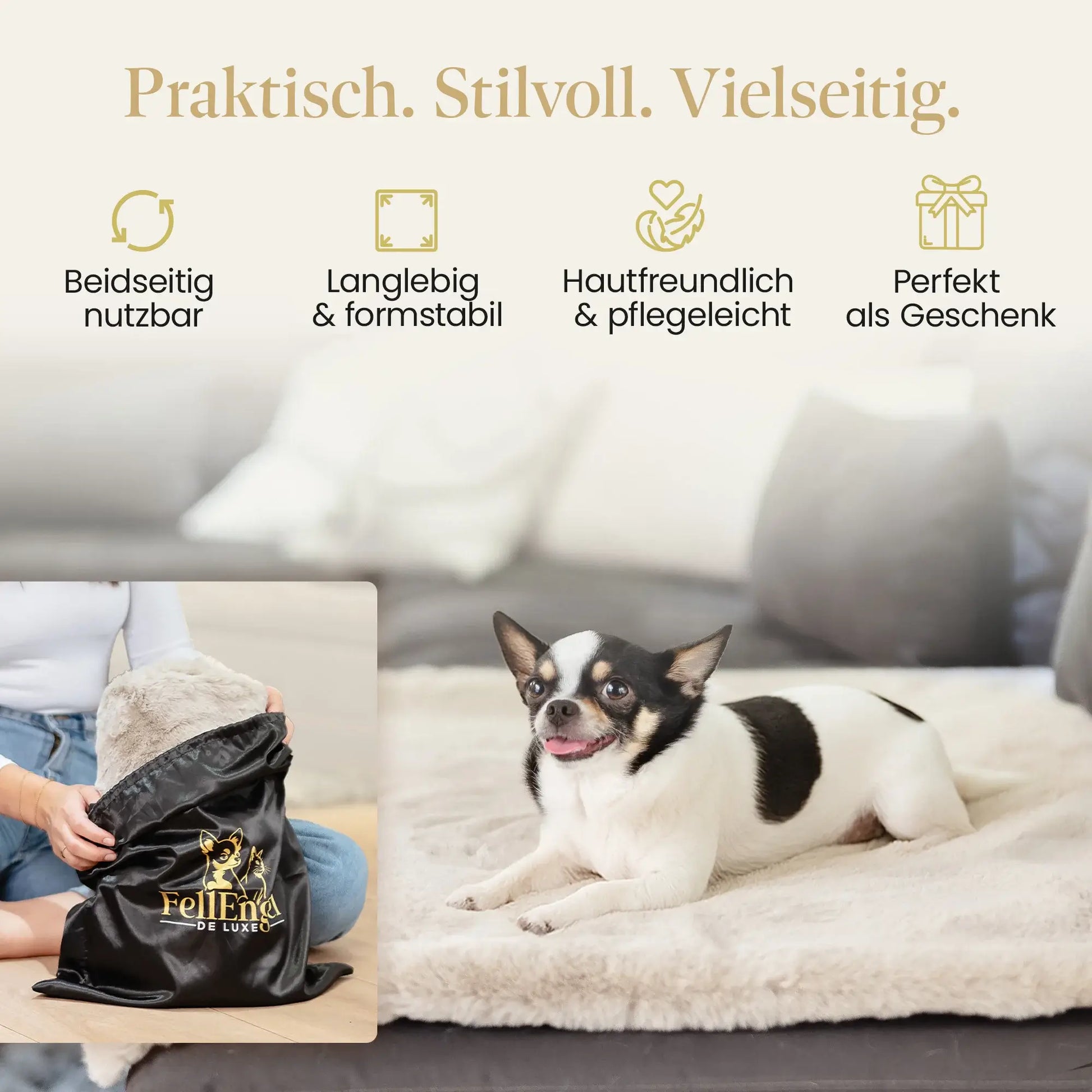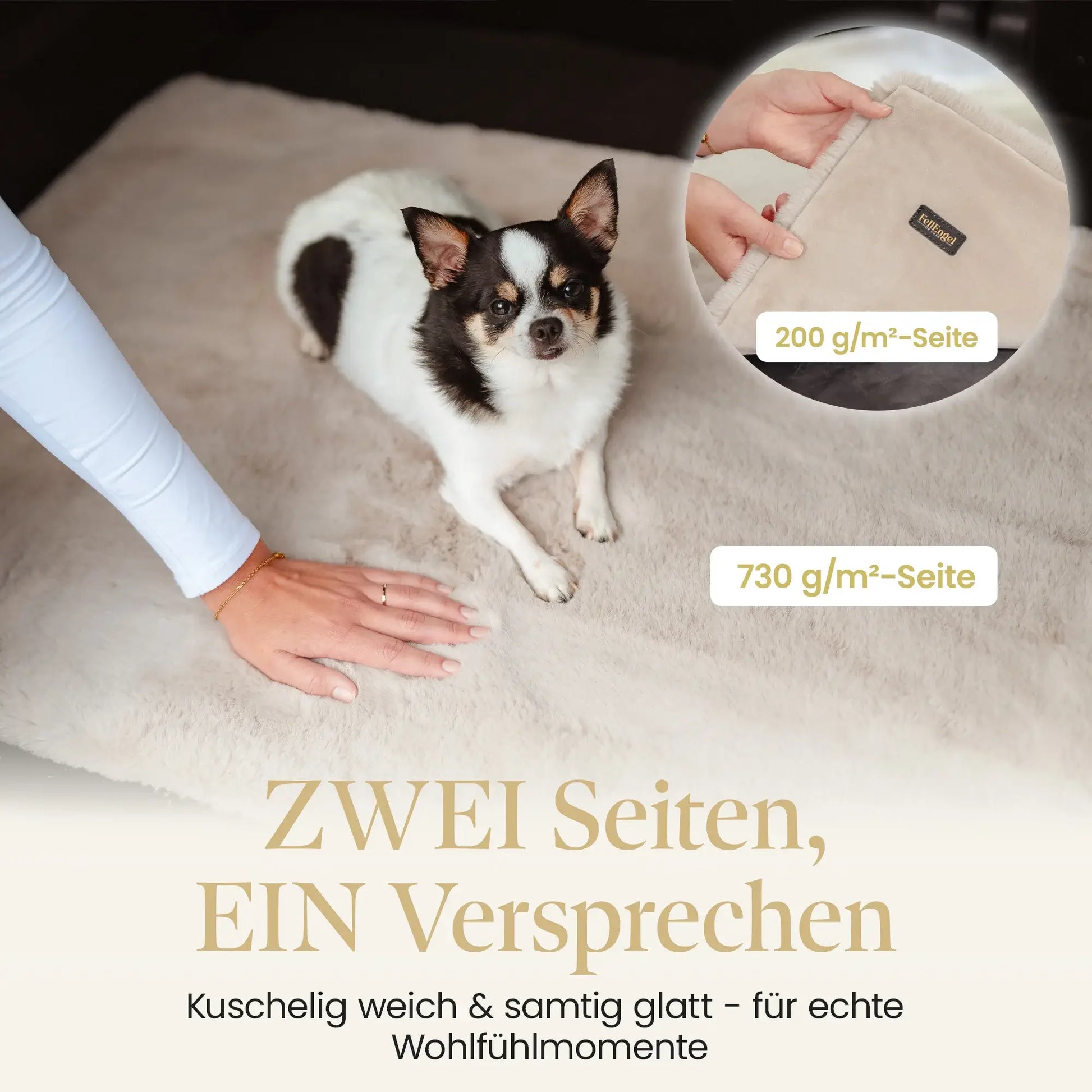 „Cashmere Grau“ und „Cashmere Beige“ unterscheiden sich nur optisch. Qualität, Material und Größe sind identisch – wähle die Farbe, die am besten zu deinem Interior oder Fell passt.